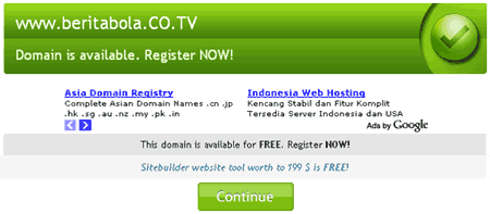 5. Jika ada pesan seperti gambar dibawah ini, berarti domain ini belum ada yang punya. Klik tombol CONTINUE