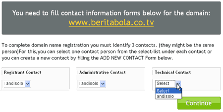 10. Untuk Registrant, Admin dan Technical Contact isikan username Anda sewaktu mendaftar di langkah No.7 (dalam hal ini userid-nya adalah andisolo) seperti pada gambar dibawah ini. Klik tombol CONTINUE